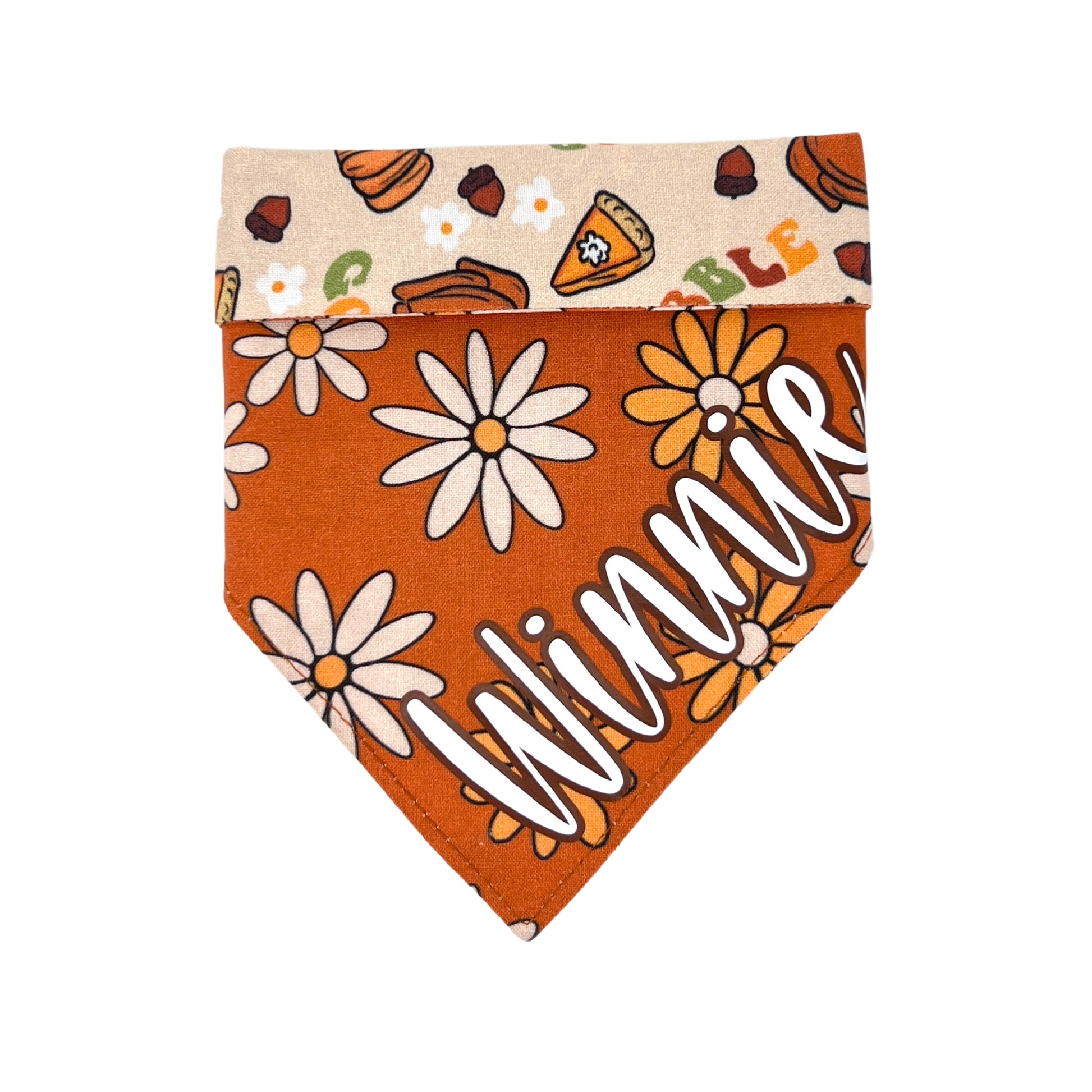 This reversible dog bandana will have your pup showing off their style this Thanksgiving. Featuring a boho Thanksgiving print on one side, this bandana reverses to the prettiest fall floral. For an extra-special personal touch, you can customize it by adding your dog's name to the floral side.