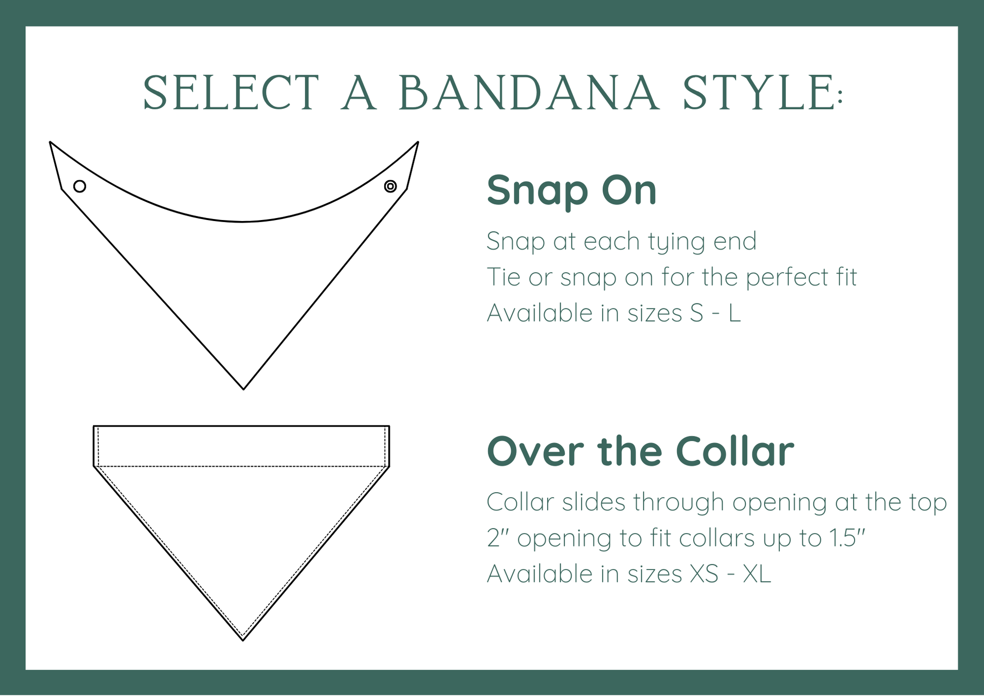 Two bandana styles to choose from: over the collar or tie on with snaps.