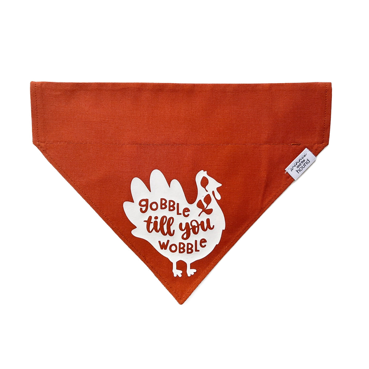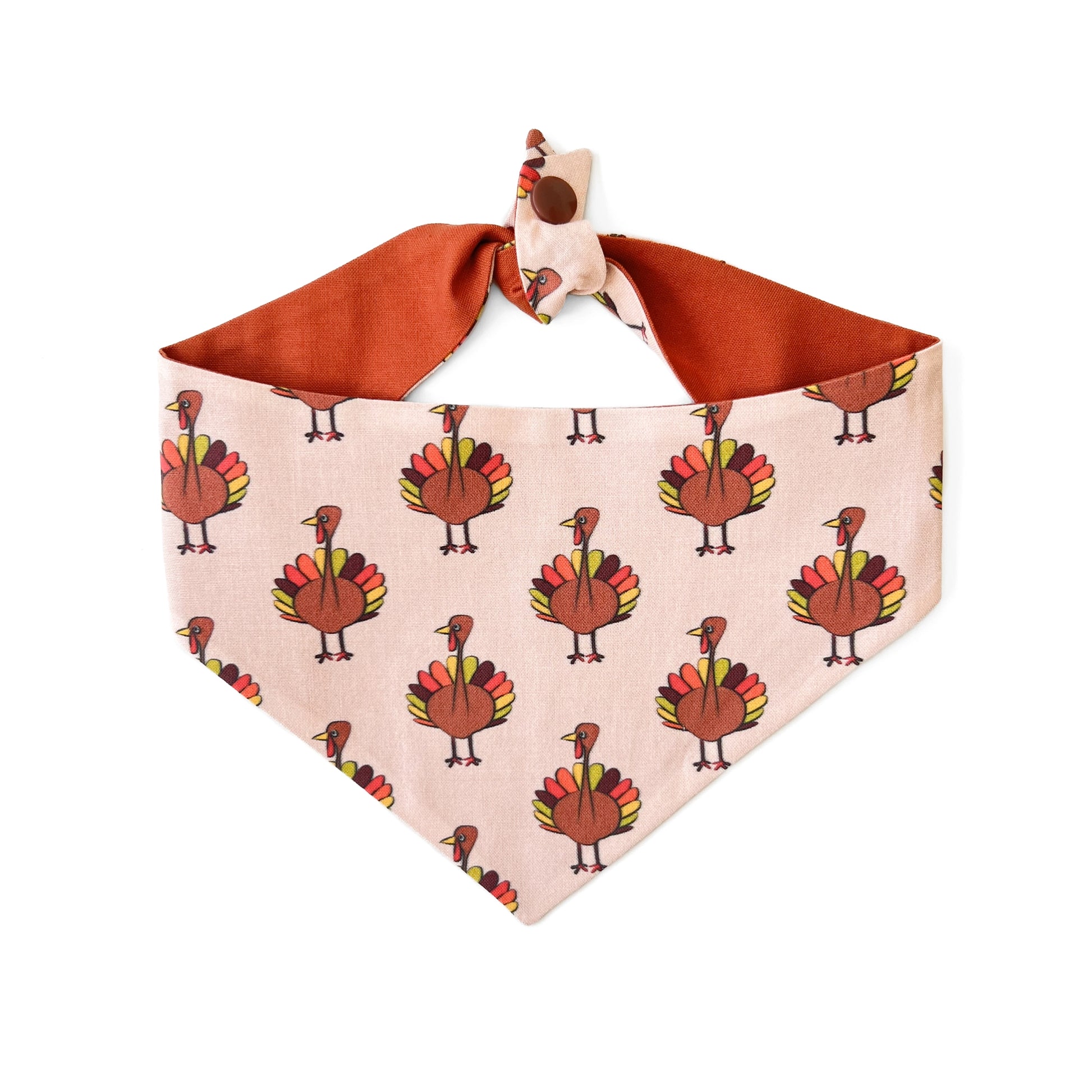 Featuring a festive flock of turkeys perched atop a blush-colored fabric, this reversible dog bandana is guaranteed to be the cutest accessory at the Thanksgiving table. And for an extra touch of fun, add the phrase "Gobble 'til You Wobble" to the solid colored reverse side (for an additional $4).