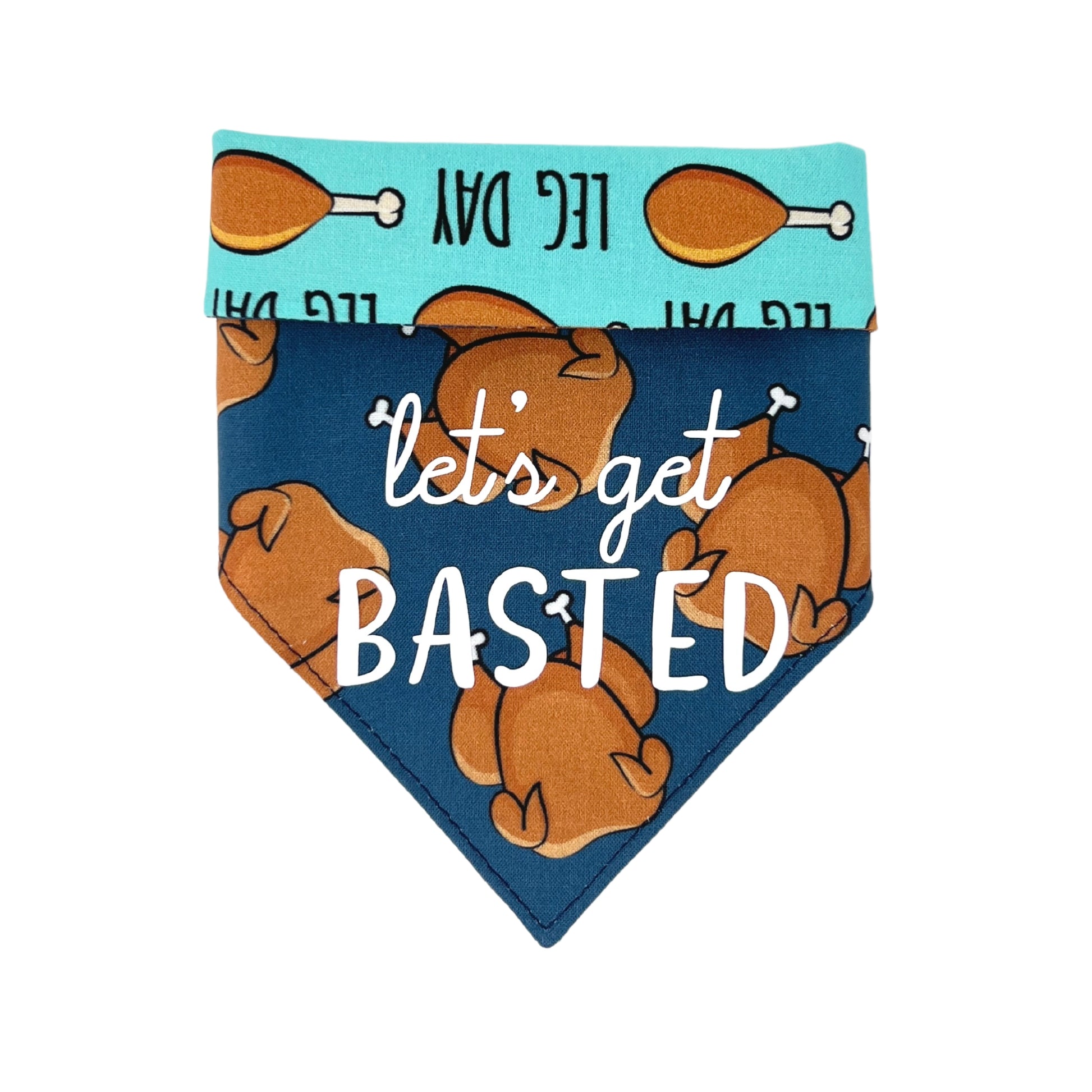Who's ready to get basted this Thanksgiving?! Your pup will show the world they mean business this Turkey Day with this reversible Leg Day dog bandana, which reverses to a solid navy with turkeys. Don't forget to add the cheeky phrase "Let's Get Basted!" to the navy side for extra laughs!